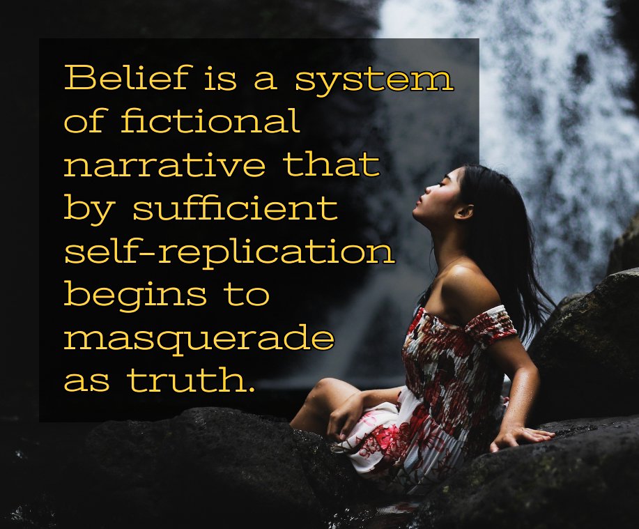 Belief is a system of fictional narrative that by sufficient self-replication begins to masquerade as truth.