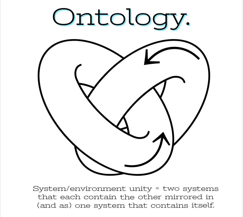 The Mobius strip is something of a cliché in this context. Systems are, yes, their environments (holding one’s breath indefinitely makes this point with effect). The question is, or becomes, how best to incept the communication of a pre-existing unified and organic totality that sits mischievously outside the fabricated boundaries of organisational, cognitive and linguistic orthodoxy?