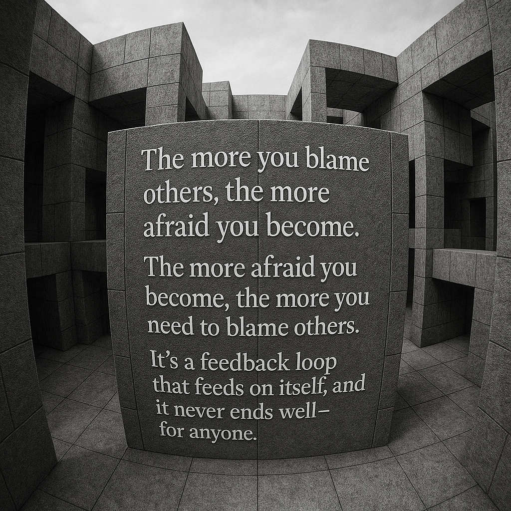 The more you blame others, the more afraid you become. The more afraid you become, the more you need to blame others. Blame draws breath: inhale the fear of others, exhale the accusation that keeps it alive. The cycle is seductive because it feels like control—naming enemies, drawing lines, standing strong—but what sustains it is … Continue reading Fascism Redux: Brittle, Brutal, Broken